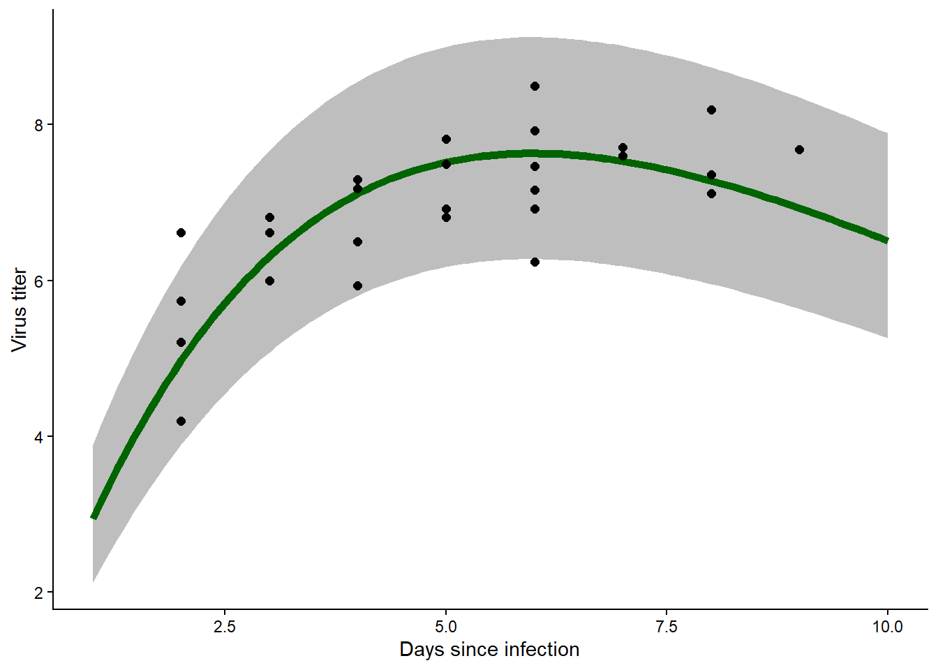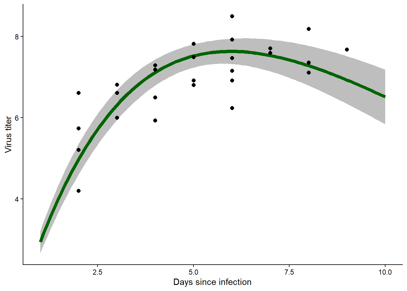 Again, you can assume that there is a dataframe in your environment named ‘myxdat’ with columns named ‘days’ and ‘titer’ that contain the data.