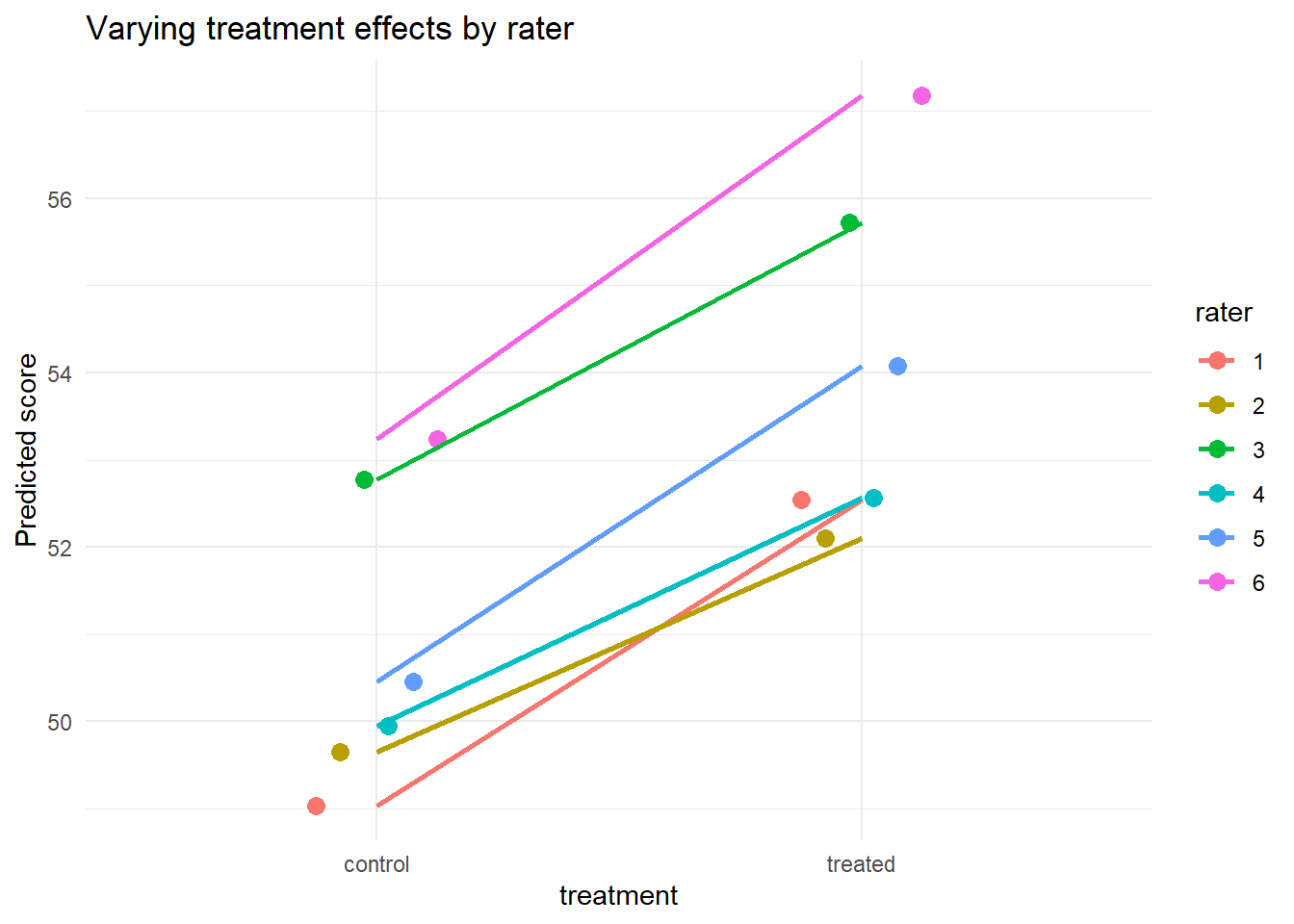 labs(y = "Predicted score", title = "Varying treatment effects by rater") +